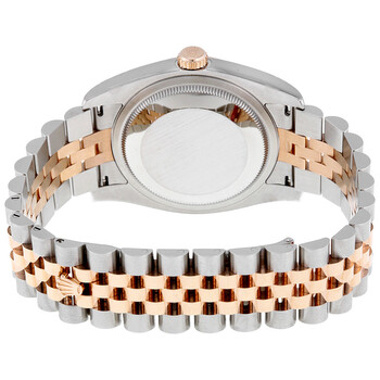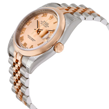 Stainless steel case with a stainless steel Rolex jubilee bracelet with 18kt everose gold center links. Fixed domed 18kt everose gold bezel. Pink dial with rose gold hands and Roman numeral hour markers. Minute markers around the outer rim. Dial Type: Analog. Date display at the 3 o'clock position. Automatic movement with a 50-hour power reserve. Scratch resistant sapphire crystal. Screw down crown. Solid case back. Case size: 36 mm. Round case shape. Concealed crown clasp. Water resistant at 100 meters / 330 feet. Functions: date, hour, minute, second. Luxury watch style. Watch label: Swiss Made. Rolex Datejust 36 Pink Dial Steel and 18K Everose Gold Jubilee Men's Watch 116201PKRJ.