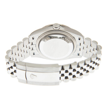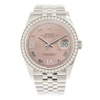 Silver-tone stainless steel case with a silver-tone stainless steel rolex jubilee bracelet. Fixed-diamond set bezel. Pink dial with silver-tone hands and Roman-diamond numerals hour markers. Dial Type: Analog. Date display at the 3 o'clock position. Rolex Calibre 3235 automatic movement with a 70-hour power reserve. Scratch resistant sapphire crystal. Screw down crown. Solid case back. Round case shape. Case size: 36 mm. Folding clasp. Water resistant at 100 meters / 330 feet. Functions: date, hour, minute, second. Luxury watch style. Watch label: Swiss Made. Rolex Datejust 36 Pink Diamond Dial Automatic Unisex Jubilee Watch 126284PRDJ.