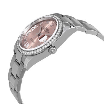 Stainless steel case with a stainless steel Rolex oyster bracelet. Fixed stainless steel set with diamonds bezel. Pink dial with silver-tone hands and Roman numeral hour markers. Diamond-set Roman numerals appear at the 6 and 9 o'clock positions. Minute markers around the outer rim. Dial Type: Analog. Date display at the 3 o'clock position. Rolex calibre 3235 automatic movement, based upon Rolex 3035, containing 31 Jewels, bitting at 28800 vph, and has a power reserve of approximately 70 hours. Scratch resistant sapphire crystal. Screw down crown. Solid case back. Round case shape. Case size: 36 mm. Fold over oyster clasp. Water resistant at 100 meters / 330 feet. Functions: date, hour, minute, second. Datejust 36 Series. Luxury watch style. Watch label: Swiss Made. Rolex Datejust 36 Pink Diamond Dial Automatic Unisex Oyster Watch 126284PRDO.