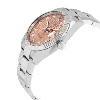 Oystersteel steel case with a stainless steel Rolex oyster bracelet. Fixed fluted oystersteel steel bezel. Pink jubilee dial with silver-tone hands and diamond hour markers. Dial Type: Analog. Date display at the 3 o'clock position. Rolex calibre 3235 automatic movement, based upon Rolex 3035, containing 31 Jewels, bitting at 28800 vph, and has a power reserve of approximately 70 hours. Scratch resistant sapphire crystal. Screw down crown. Solid case back. Round case shape. Case size: 36 mm. Fold over clasp. Water resistant at 100 meters / 330 feet. Functions: date, hour, minute, second. Datejust 36 Series. Luxury watch style. Watch label: Swiss Made. Rolex Datejust 36 Pink Jubilee Diamond Dial Automatic Men's Oyster Watch 126234PJDO.
