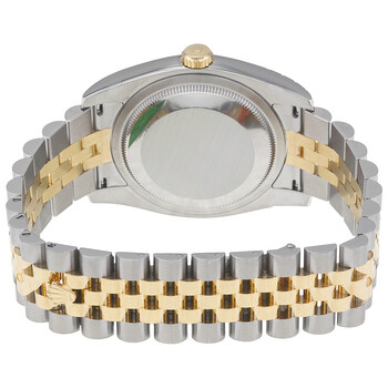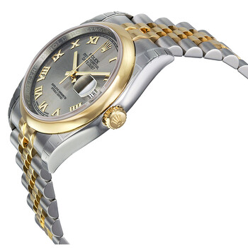 Stainless steel case with a stainless steel Rolex jubilee bracelet with 18kt yellow center links. Fixed domed 18kt yellow gold bezel. Rhodium dial with gold-tone hands and Roman numeral hour markers. Minute markers around the outer rim. Dial Type: Analog. Date display at the 3 o'clock position. Automatic movement. Scratch resistant sapphire crystal. Screw down crown. Solid case back. Case size: 36 mm. Round case shape. Water resistant at 100 meters / 330 feet. Functions: date, hour, minute, second. Luxury watch style. Watch label: Swiss Made. Rolex Datejust 36 Rhodium Dial Steel and 18K Yellow Gold Jubilee Men's Watch 116203RRJ.