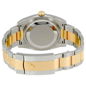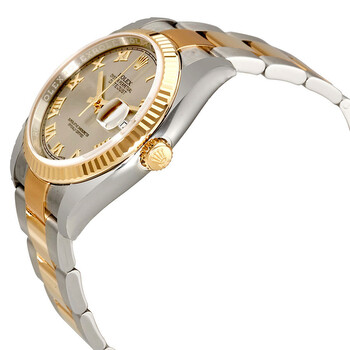 Stainless steel case with a stainless steel Rolex oyster bracelet with 18kt yellow gold center links. Fixed fluted 18kt yellow gold bezel. Rhodium dial with yellow gold-tone hands and Roman numeral hour markers. Minute markers around the outer rim. Dial Type: Analog. Date display at the 3 o'clock position. Rolex calibre 3135 automatic movement with a 48-hour power reserve. Scratch resistant sapphire crystal. Screw down crown. Solid case back. Case size: 36 mm. Round case shape. Oysterlock clasp. Water resistant at 100 meters / 330 feet. Functions: date, hour, minute, second. Luxury watch style. Watch label: Swiss Made. Rolex Datejust 36 Rhodium Dial Steel and 18K Yellow Gold Men's Watch 116233RRO.