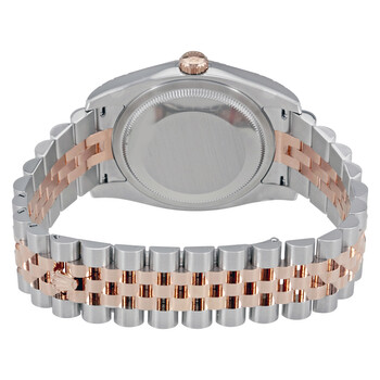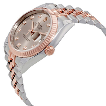Stainless steel case with a stainless steel Rolex jubilee bracelet with 18kt everose gold center links. Fixed fluted 18kt everose gold bezel. Rhodium dial with rose gold hands and diamond hour markers. Dial Type: Analog. Date display at the 3 o'clock position. Automatic movement with a 50-hour power reserve. Scratch resistant sapphire crystal. Screw down crown. Solid case back. Case size: 36 mm. Round case shape. Concealed crown clasp. Water resistant at 100 meters / 330 feet. Functions: date, hour, minute, second. Luxury watch style. Watch label: Swiss Made. Rolex Datejust 36 Rhodium Diamond Dial Steel and 18kt Everose Gold Men's Watch 116231RDJ.