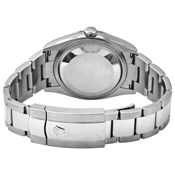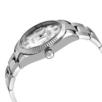 Stainless steel and 18k white gold case with a stainless steel rolex oyster bracelet. Fixed fluted stainless steel and 18kt white gold fluted bezel bezel. Silver dial with silver-tone hands and Roman- diamonds numeral hour markers. Dial Type: Analog. Date display at the 3 o'clock position. Rolex Calibre 3235 automatic movement with a 70-hour power reserve. Scratch resistant sapphire crystal. Screw down crown. Solid case back. Round case shape. Case size: 36 mm. Oysterlock clasp. Water resistant at 100 meters / 330 feet. Functions: date, hour, minute, second. Luxury watch style. Watch label: Swiss Made. Rolex Datejust 36 Silver Diamond Dial Automatic Ladies Oyster Watch 126234SRDO.