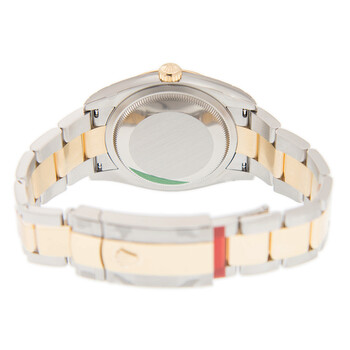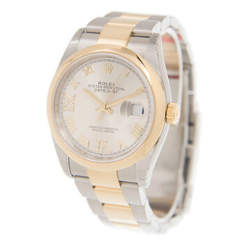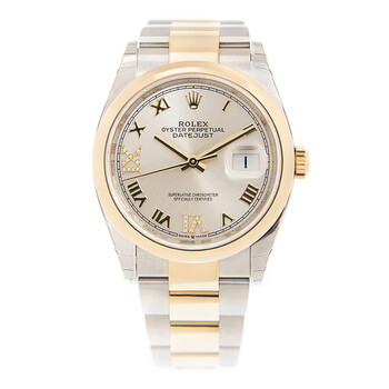 Stainless steel and 18k yellow gold case with a stainless steel and 18k yellow gold rolex oyster bracelet. Fixed-domed bezel. Silver dial with yellow gold hands and Roman numerals hour markers. Dial Type: Analog. Date display at the 6 o'clock position. Rolex Calibre 3235 automatic movement with a 70-hour power reserve. Scratch resistant sapphire crystal. Screw down crown. Solid case back. Round case shape. Case size: 36 mm. Water resistant at 100 meters / 330 feet. Functions: date, hour, minute, second. Luxury watch style. Watch label: Swiss Made. Rolex Datejust 36 Silver Diamond Dial Automatic Men's Steel and 18k Yellow Gold Oyster Watch 126203SRDO.