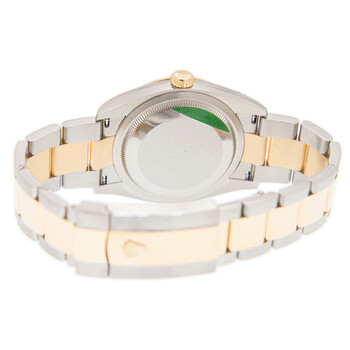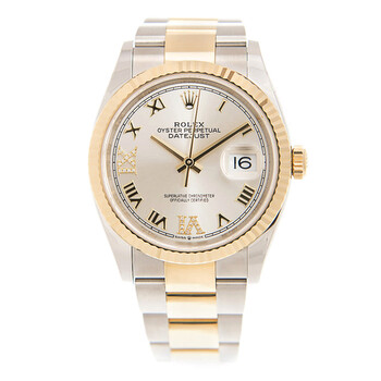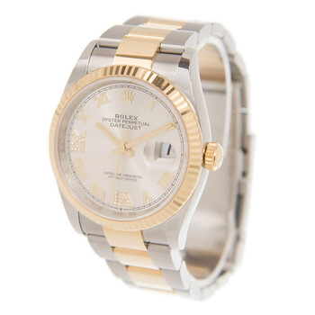 Stainless steel and 18kt yellow gold case with a two-tone (silver-tone and gold-tone) stainless steel and 18kt yellow gold rolex oyster bracelet. Fixed 18kt yellow gold bezel. Silver dial with yellow gold hands and Roman numeral hour markers. Minute markers around the outer rim. Dial Type: Analog. Date display at the 3 o'clock position. Rolex Calibre 3235 Automatic movement, based upon Rolex 3035, containing 31 Jewels, bitting at 28800 vph, and has a power reserve of approximately 70 hours. Scratch resistant sapphire crystal. Screw down crown. Solid case back. Round case shape. Case size: 36 mm. Oyster clasp. Water resistant at 100 meters / 330 feet. Functions: date, hour, minute, second. Luxury watch style. Watch label: Swiss Made. Rolex Datejust 36 Silver Diamond Dial Men's Stainless Steel and 18kt Yellow Gold Oyster Watch 126233SRDO.