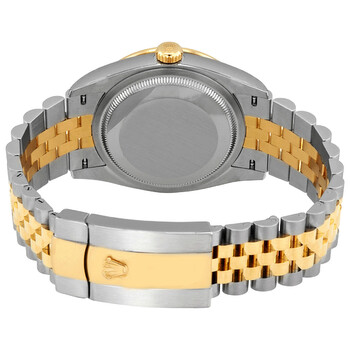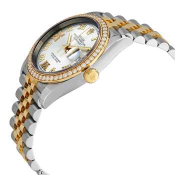 Stainless steel case with a stainless steel Rolex jubilee bracelet with 18kt yellow gold center links. Fixed 18kt yellow gold bezel set with diamonds. Silver dial with yellow gold hands and Roman numeral hour markers. Diamond-set Roman numerals appear at the 6 and 9 o'clock positions. Minute markers around the outer rim. Dial Type: Analog. Date display at the 3 o'clock position. Rolex calibre 3235 automatic movement, based upon Rolex 3035, containing 31 Jewels, bitting at 28800 vph, and has a power reserve of approximately 70 hours. Scratch resistant sapphire crystal. Screw down crown. Solid case back. Round case shape. Case size: 36 mm. Fold over clasp. Water resistant at 100 meters / 330 feet. Functions: date, hour, minute, second. Datejust 36 Series. Luxury watch style. Watch label: Swiss Made. Rolex Datejust 36 Silver Diamond Dial Steel and 18kt Yellow Gold Jubilee Watch 126283SRDJ.