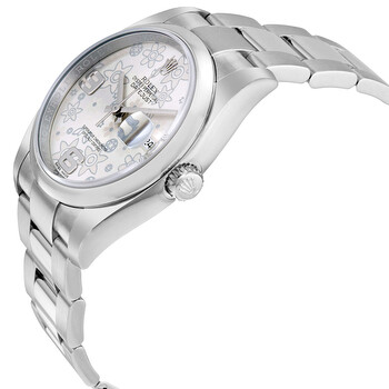 Stainless steel case with a stainless steel Rolex oyster bracelet. Fixed domed stainless steel bezel. Silver floral dial with silver-tone hands. Arabic numerals mark the 6 and 9 o'clock positions. Dial Type: Analog. Date display at the 3 o'clock position. Automatic movement with a 50-hour power reserve. Scratch resistant sapphire crystal. Screw down crown. Solid case back. Case diameter: 36 mm. Round case shape. Fold over clasp. Water resistant at 100 meters / 330 feet. Functions: date, hour, minute, second. Luxury watch style. Watch label: Swiss Made. Rolex Datejust 36 Silver floral Dial Stainless Steel Rolex Oyster Automatic Ladies Watch 116200SFAO.