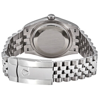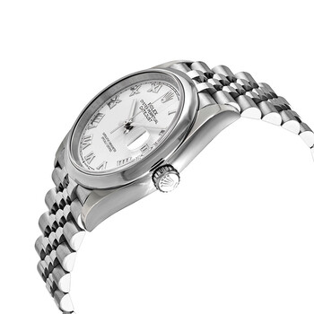 Silver-tone stainless steel case with a silver-tone stainless steel rolex jubilee bracelet. Fixed- domed silver-tone stainless steel bezel. White dial with silver-tone hands and Roman numeral hour markers. Minute markers around the outer rim. Dial Type: Analog. Luminescent hands and markers. Date display at the 3 o'clock position. Rolex Calibre 3235 automatic movement with a 70-hour power reserve. Scratch resistant sapphire crystal. Screw down crown. Solid case back. Round case shape. Case size: 36 mm. Folding oyster clasp. Water resistant at 100 meters / 330 feet. Functions: date, hour, minute, second, chronometer. Luxury watch style. Watch label: Swiss Made. Rolex Datejust 36 Automatic White Dial Men's Jubilee Watch 126200WRJ.