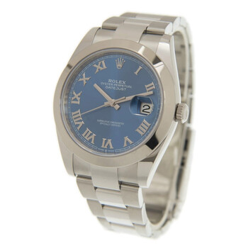 Stainless steel case with a stainless steel oyster bracelet. Fixed smooth stainless steel bezel. Blue dial with silver-tone hands and Roman numeral hour markers. Minute markers around the outer rim. Dial Type: Analog. Luminescent hands. Date display at the 3 o'clock position. Rolex calibre 3235 automatic movement with a 70-hour power reserve. Scratch resistant sapphire crystal. Screw down crown. Solid case back. Round case shape. Case size: 41 mm. Oysterlock clasp. Water resistant at 100 meters / 330 feet. Functions: date, hour, minute, second. Luxury watch style. Watch label: Swiss Made. Rolex Datejust 41 Automatic Blue Dial Stainless Steel Men's Watch 126300 0017.