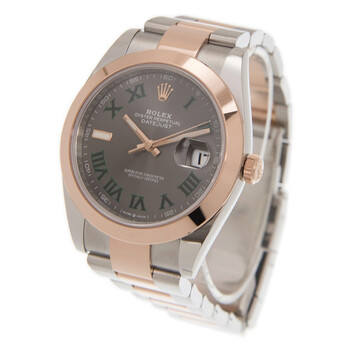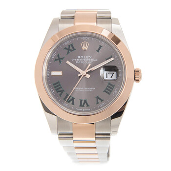 Silver-tone stainless steel case with a two-tone (silver-tone and rose gold-tone) stainless steel and 18kt everose gold rolex oyster bracelet. Fixed 18kt everose gold bezel. Grey dial with rose gold-tone hands and Roman numeral hour markers. Minute markers around the outer rim. Dial Type: Analog. Luminescent hands and markers. Date display at the 3 o'clock position. Rolex Calibre 3235 Automatic movement, based upon Rolex 3035, containing 31 Jewels, bitting at 28800 vph, and has a power reserve of approximately 70 hours. Scratch resistant sapphire crystal. Screw down crown. Solid case back. Round case shape, case size: 41 mm. Oysterlock clasp. Water resistant at 100 meters / 330 feet. Functions: date, hour, minute, second, chronometer. Datejust 41 Series. Luxury watch style. Watch label: Swiss Made. Rolex Datejust 41 Automatic Chronometer Grey Dial Men's Watch 126301-0015.