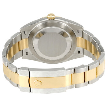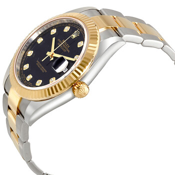 Stainless steel case with a stainless steel Rolex oyster bracelet with 18kt yellow gold center links. Fixed fluted 18kt yellow gold bezel. Black dial with yellow gold-tone hands and diamond hour markers. Minute markers around the outer rim. Dial Type: Analog. Date display at the 3 o'clock position. Rolex calibre 3235 automatic movement with a 70-hour power reserve. Scratch resistant sapphire crystal. Screw down crown. Solid case back. Case size: 41 mm. Round case shape. Oysterlock clasp. Water resistant at 100 meters / 330 feet. Functions: date, hour, minute, second. Luxury watch style. Watch label: Swiss Made. Rolex Datejust 41 Black Dial Diamond Steel and 18K Yellow Gold Oyster Men's Watch 12633BKDO.
