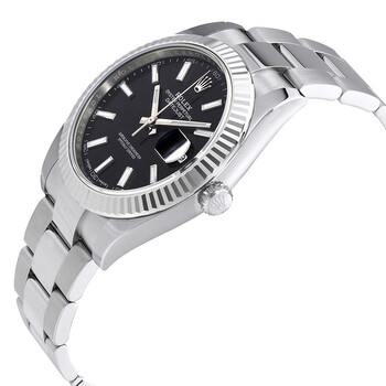 Stainless steel case with a stainless steel Rolex oyster bracelet. Fixed fluted 18kt white gold bezel. Black dial with luminous silver-tone hands and index hour markers. Minute markers around the outer rim. Dial Type: Analog. Luminescent hands and markers. Date display at the 3 o'clock position. Rolex Calibre 3235 automatic movement with a 70-hour power reserve. Scratch resistant sapphire crystal. Screw down crown. Solid case back. Round case shape. Case size: 41 mm. Oysterlock clasp. Water resistant at 100 meters / 330 feet. Functions: date, hour, minute, second. Luxury watch style. Watch label: Swiss Made. Rolex Datejust 41 Black Dial Stainless Steel Automatic Men's Watch 126334BKSO.