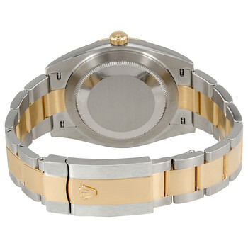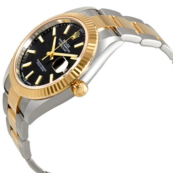Stainless steel case with a stainless steel Rolex oyster bracelet with 18kt yellow gold center links. Fixed fluted 18kt yellow gold bezel. Black dial with luminous yellow gold-tone hands and index hour markers. Minute markers around the outer rim. Dial Type: Analog. Luminescent hands and markers. Date display at the 3 o'clock position. Rolex calibre 3235 automatic movement, based upon Rolex 3035, containing 31 Jewels, bitting at 28800 vph, and has a power reserve of approximately 70 hours. Scratch resistant sapphire crystal. Screw down crown. Solid case back. Round case shape. Case size: 41 mm. Oysterlock clasp. Water resistant at 100 meters / 330 feet. Functions: date, hour, minute, second, chronometer. Datejust 41 Series. Luxury watch style. Watch label: Swiss Made. Item Variations: 126333-72613. Rolex Datejust 41 Black Dial Steel and 18K Yellow Gold Oyster Men's Watch 12633BKSO.