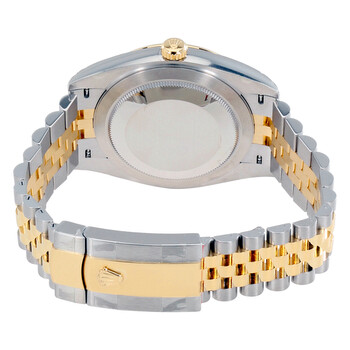 Stainless steel case with a stainless steel Rolex jubilee bracelet with 18kt yellow gold center links. Fixed fluted 18kt yellow gold bezel. Black dial with yellow gold-tone hands and diamond / Roman numeral hour markers. Minute markers around the outer rim. Dial Type: Analog. Date display at the 3 o'clock position. Rolex calibre 3235 automatic movement with a 70-hour power reserve. Scratch resistant sapphire crystal. Screw down crown. Solid case back. Case size: 41 mm. Round case shape. Oysterlock clasp. Water resistant at 100 meters / 330 feet. Functions: date, hour, minute, second. Luxury watch style. Watch label: Swiss Made. Rolex Datejust 41 Black Diamond Dial Stee and 18K Yellow Gold Jubilee Men's Watch 12633BKDJ.