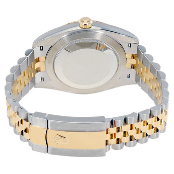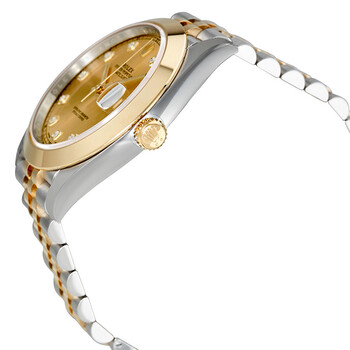 Stainless steel case with a stainless steel Rolex jubilee bracelet with 18kt yellow gold center links. Fixed 18kt yellow gold bezel. Champagne dial with yellow gold-tone hands and diamond hour markers. Minute markers around the outer rim. Dial Type: Analog. Date display at the 3 o'clock position. Rolex calibre 3235 automatic movement with a 70-hour power reserve. Scratch resistant sapphire crystal. Screw down crown. Solid case back. Case size: 41 mm. Round case shape. Oysterlock clasp. Water resistant at 100 meters / 330 feet. Functions: date, hour, minute, second. Luxury watch style. Watch label: Swiss Made. Rolex Datejust 41 Champagne Diamond Dial Steel and 18K Yellow Gold Jubilee Men's Watch 126303CDJ.