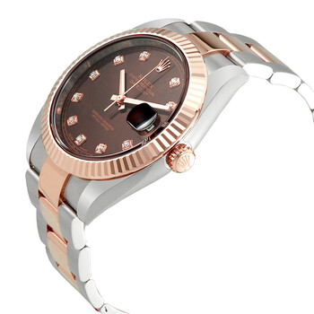 Stainless steel case with a stainless steel Rolex oyster bracelet with 18kt everose gold center links. Fixed fluted 18kt everose gold bezel. Chocolate dial with rose gold-tone hands and diamond / Roman numeral hour markers. Minute markers around the outer rim. Dial Type: Analog. Date display at the 3 o'clock position. Rolex calibre 3235 automatic movement with a 70-hour power reserve. Scratch resistant sapphire crystal. Screw down crown. Solid case back. Round case shape. Case size: 41 mm. Concealed crown clasp. Water resistant at 100 meters / 330 feet. Functions: date, hour, minute, second, chronometer. Luxury watch style. Watch label: Swiss Made. Item Variations: 126331-72611. Rolex Datejust 41 Chocolate Diamond Dial Steel and 18K Everose Gold Oyster Men's Watch 126331CHDO.