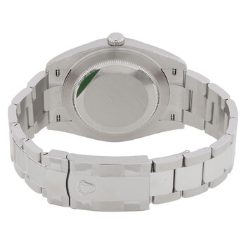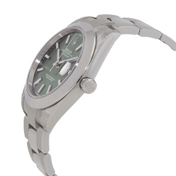 Silver-tone stainless steel case with a silver-tone stainless steel oyster bracelet. Fixed stainless steel bezel. Mint green dial with silver-tone hands and index hour markers. Dial Type: Analog. Luminescent hands and markers. Date display at the 3 o'clock position. Automatic movement. Scratch resistant sapphire crystal. Screw down crown. Solid case back. Round case shape, case size: 41 mm. Folding oyster clasp. Water resistant at 100 meters / 330 feet. Functions: date, hour, minute, second. Datejust 41 Series. Luxury watch style. Watch label: Swiss Made. Rolex Datejust 41 Mint Green Dial Automatic Men's Oyster Watch M126300-0019.