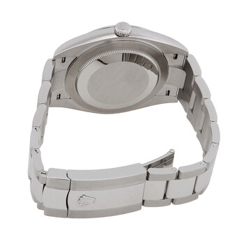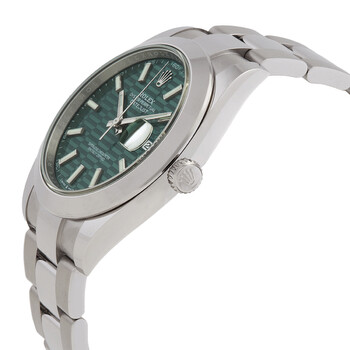 Silver-tone stainless steel case with a silver-tone stainless steel oyster bracelet. Fixed stainless steel bezel. Mint green fluted motif dial with silver-tone hands and index hour markers. Dial Type: Analog. Luminescent hands and markers. Date display at the 3 o'clock position. Rolex Calibre 3235 Automatic movement, based upon Rolex 3035, containing 31 Jewels, bitting at 28800 vph, and has a power reserve of approximately 70 hours. Scratch resistant sapphire crystal. Screw down crown. Solid case back. Round case shape, case size: 41 mm. Folding oyster clasp. Water resistant at 100 meters / 330 feet. Functions: date, hour, minute, second. Datejust 41 Series. Luxury watch style. Watch label: Swiss Made. Rolex Datejust 41 Mint Green Fluted Motif Dial Automatic Men's Oyster Watch M126300-0021.