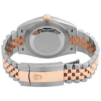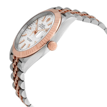 Stainless steel and 18kt everose gold case with a stainless steel and 18kt everose gold jubilee bracelet. Fixed bezel. Silver, fluted motif dial with everose gold hands and index hour markers. Dial Type: Analog. Date display at the 3 o'clock position. Rolex Calibre 3235 Automatic movement, based upon Rolex 3035, containing 31 Jewels, bitting at 28800 vph, and has a power reserve of approximately 70 hours. Scratch resistant sapphire crystal. Screw down crown. Solid case back. Round case shape, case size: 41 mm. Folding oyster clasp. Water resistant at 100 meters / 330 feet. Functions: date, hour, minute, second. Datejust 41 Series. Luxury watch style. Watch label: Swiss Made. Rolex Datejust 41 Silver, Fluted Motif Dial Automatic Men's 18kt Everose Gold Jubilee Watch M126331-0018.