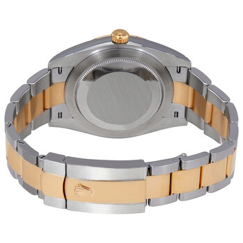 Stainless steel case with a stainless steel Rolex oyster bracelet with 18kt yellow gold center links. Fixed 18kt yellow gold bezel. Slate dial with luminous yellow gold-tone hands and Roman numeral hour markers. Arabic numeral minute markers (at 5 minute intervals). Minute markers around the outer rim. Dial Type: Analog. Luminescent hands. Date display at the 3 o'clock position. Rolex calibre 3235 automatic movement, based upon Rolex 3035, containing 31 Jewels, bitting at 28800 vph, and has a power reserve of approximately 70 hours. Scratch resistant sapphire crystal. Screw down crown. Solid case back. Round case shape. Case size: 41 mm. Oyster clasp. Water resistant at 100 meters / 330 feet. Functions: date, hour, minute, second, chronometer. Datejust 41 Series. Luxury watch style. Watch label: Swiss Made. Item Variations: 126303-0019. Rolex Datejust 41 Slate Dial Automatic Men's Steel and 18kt Yellow Gold Oyster Watch 126303GYRO.
