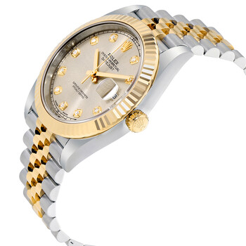 Stainless steel case with a stainless steel bracelet with 18kt yellow gold center links. Fixed fluted 18kt yellow gold bezel. Sundust dial with yellow gold-tone hands and diamond / small Roman numeral hour markers. Minute markers around the outer rim. Dial Type: Analog. Date display at the 3 o'clock position. Rolex calibre 3235 automatic movement with a 70-hour power reserve. Scratch resistant sapphire crystal. Screw down crown. Solid case back. Case size: 41 mm. Round case shape. Concealed crown clasp. Water resistant at 100 meters / 330 feet. Functions: date, hour, minute, second. Luxury watch style. Watch label: Swiss Made. Rolex Datejust 41 Sundust Diamond Dial Steel and 18K Yellow Gold Men's Watch 126333SNDJ.