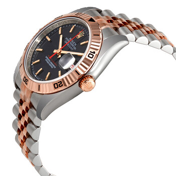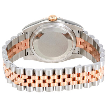 Stainless steel case with a stainless steel bracelet with 18kt pink gold center links. Turn-o-graph 18kt pink gold bezel. Black dial with luminous pink gold-tone hands and index hour markers. Minute markers around the outer rim. Dial Type: Analog. Luminescent hands and markers. Date display at the 3 o'clock position. Rolex calibre 3135 automatic movement with a 50-hour power reserve. Scratch resistant sapphire crystal. Screw down crown. Solid case back. Case size: 36 mm. Round case shape. Concealed crown clasp. Water resistant at 100 meters / 330 feet. Functions: date, hour, minute, second, chronometer. Luxury watch style. Watch label: Swiss Made. Rolex DatejustAutomatic Black Dial Pink Gold and Stainless Steel Men's Watch 116261BKSJ.