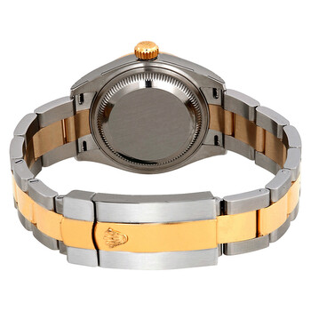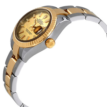 Stainless steel case with a stainless steel Rolex oyster bracelet with 18kt yellow gold Rolex oyster links. Fixed fluted 18kt yellow gold bezel. Champagne dial with gold-tone hands and index hour markers. Minute markers around the outer rim. Dial Type: Analog. Luminescent hands and markers. Date display at the 3 o'clock position. Rolex calibre 2236 automatic movement, based upon Rolex 2235, containing 31 Jewels, bitting at 28800 vph, and has a power reserve of approximately 55 hours. Scratch resistant sapphire crystal. Screw down crown. Solid case back. Round case shape. Case size: 28 mm. Oyster clasp. Water resistant at 100 meters / 330 feet. Functions: date, hour, minute, second, chronometer. Datejust Series. Luxury watch style. Watch label: Swiss Made. Rolex Datejust Automatic Champagne Dial Ladies Steel and 18kt Yellow Gold Oyster Watch 279173CSO.