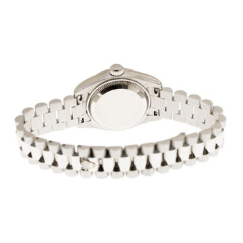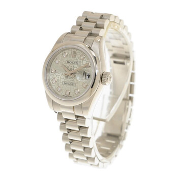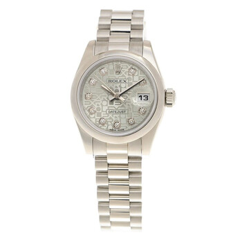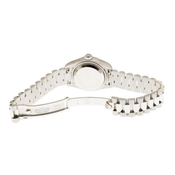 Silver-tone platinum case with a silver-tone platinum president bracelet. Fixed silver-tone platinum bezel. Ice blue jubilee dial with silver-tone hands and diamond hour markers. Dial Type: Analog. Date display at the 3 o'clock position. Rolex Calibre 2235 Automatic movement, containing 31 Jewels, bitting at 28800 vph, and has a power reserve of approximately 48 hours. Scratch resistant sapphire crystal. Screw down crown. Solid case back. Round case shape, case size: 26 mm. Crown clasp. Water resistant at 100 meters / 330 feet. Functions: date, hour, minute, second, chronometer. Additional Info: original box, international warranty card, manual (complete accessories). Datejust Series. Luxury watch style. Watch label: Swiss Made. Rolex Datejust Automatic Chronometer Diamond Ladies Watch 179166IBJDP.