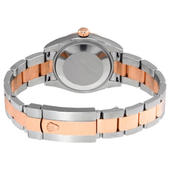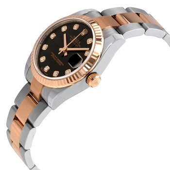 Stainless steel and 18kt everose gold case with a two-tone (silver-tone and gold-tone) stainless steel and 18kt everose gold rolex oyster bracelet. Fixed, fluted 18kt everose gold bezel. Black dial with rose gold-tone hands and diamonds hour markers. Dial Type: Analog. Date display at the 3 o'clock position. Rolex Calibre 2235 automatic movement with a 48-hour power reserve. Scratch resistant sapphire crystal. Screw down crown. Solid case back. Round case shape. Case size: 31 mm. Water resistant at 100 meters / 330 feet. Functions: date, hour, minute, second. Luxury watch style. Watch label: Swiss Made. Rolex Datejust Automatic Diamond Black Dial Ladies Watch 178271BKDO.
