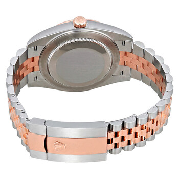 Stainless steel case with a stainless steel Rolex jubilee bracelet with 18kt everose gold center links. Fixed fluted 18kt everose gold bezel. Mother of pearl dial with everose gold hands and diamonds hour markers. Dial Type: Analog. Date display at the 3 o'clock position. Rolex calibre 3235 automatic movement with a 70-hour power reserve. Scratch resistant sapphire crystal. Screw down crown. Solid case back. Round case shape. Case size: 41 mm. Water resistant at 100 meters / 330 feet. Functions: date, hour, minute, second. Luxury watch style. Watch label: Swiss Made. Rolex Datejust Automatic Diamond Men's Steel and 18ct Everose Gold Jubilee Watch 126331MDJ.
