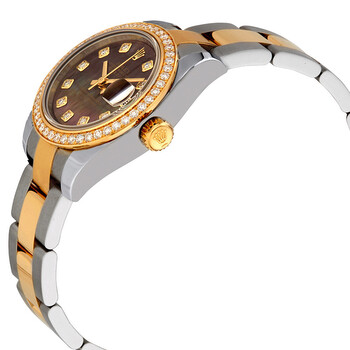 18kt yellow gold case with a two-tone (silver-tone and gold-tone) stainless steel with 18kt yellow gold rolex oyster bracelet. Fixed 18kt yellow gold diamond set bezel. Black mother of pearl dial with gold-tone hands and diamond hour markers. Dial Type: Analog. Date display at the 3 o'clock position. Rolex Calibre 2235 Automatic movement, containing 31 Jewels, bitting at 28800 vph, and has a power reserve of approximately 48 hours. Scratch resistant sapphire crystal. Screw down crown. Solid case back. Round case shape. Case size: 26 mm. Oyster clasp. Water resistant at 100 meters / 330 feet. Functions: date, hour, minute, second. Luxury watch style. Watch label: Swiss Made. Rolex Datejust Automatic Diamond Stainless Steel with 18k Yellow Gold Oyster Ladies Watch 179383BKMDO.