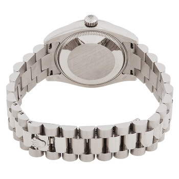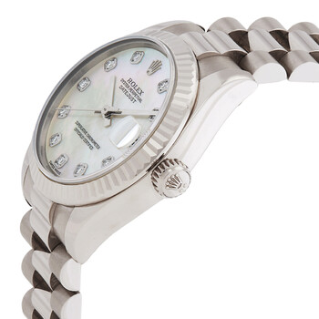 18kt white gold case with a 18kt white gold president bracelet. Fixed 18kt white gold bezel. White mother of pearl dial with silver-tone hands and diamond hour markers. Minute markers around the outer rim. Dial Type: Analog. Date display at the 3 o'clock position. Automatic movement. Scratch resistant sapphire crystal. Solid case back. Round case shape, case size: 31 mm. Concealed folding crown clasp. Water resistant at 100 meters / 330 feet. Functions: date, hour, minute, second. Datejust Series. Dress watch style. Watch label: Swiss Made. Rolex Datejust Automatic Diamond White Mother of Pearl Dial Ladies Watch 178279.