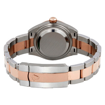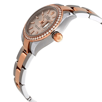 Stainless steel case with a stainless steel and 18k everose gold rolex oyster bracelet. Fixed-diamond set 18k everose gold bezel. Sundust dial with everose gold hands and index hour markers. Dial Type: Analog. Date display at the 3 o'clock position. Rolex Calibre 2236 automatic movement with a 55-hour power reserve. Scratch resistant sapphire crystal. Screw down crown. Solid case back. Round case shape. Case size: 28 mm. Water resistant at 100 meters / 330 feet. Functions: date, hour, minute, second. Additional Info: bezel set with 46 diamonds. Luxury watch style. Watch label: Swiss Made. Rolex Datejust Automatic Ladies Steel and 18K Everose Gold Oyster Watch 279381RBR.