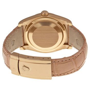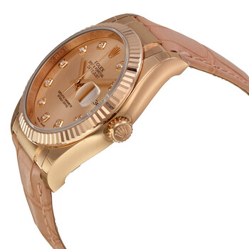18kt everose gold case with a pink leather strap. Fixed 18kt everose gold bezel. Pink dial with 18kt pink hands and diamond hour markers. Dial Type: Analog. Date display at the 3 o'clock position. Automatic movement. Scratch resistant sapphire crystal. Screw down crown. Case diameter: 36 mm. Round case shape. Deployment clasp. Water resistant at 100 meters / 330 feet. Functions: date, hour, minute, second. Luxury watch style. Watch label: Swiss Made. Rolex Datejust Automatic Pink Diamond Dial 18kt Everose Gold Ladies Watch 116135PKDL.