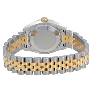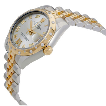 Stainless steel case with a stainless steel Rolex jubilee bracelet with 18kt yellow gold center links. Fixed 18kt yellow gold bezel set with diamonds. Silver dial with gold-tone hands and Roman numeral hour markers. Date display at the 3 o'clock position. Rolex calibre 2235 automatic movement with a 48-hour power reserve. Scratch resistant sapphire crystal. Screw down crown. Solid case back. Case size: 31 mm. Round case shape. Deployment clasp with a push button release. Water resistant at 100 meters / 330 feet. Functions: date, hour, minute, second. Luxury watch style. Watch label: Swiss Made. Rolex Datejust Automatic Silver Dial Ladies Watch 178343SRDJ.