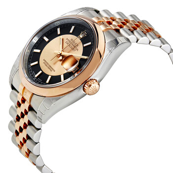 Stainless steel case with a stainless steel Rolex jubilee bracelet with 18kt everose gold center links. Fixed domed 18kt everose gold bezel. Black and champagne dial with rose gold-tone hands and index / Roman numeral hour markers. Minute markers around the outer rim. Dial Type: Analog. Date display at the 3 o'clock position. Rolex calibre 3135 automatic movement with a 48-hour power reserve. Scratch resistant sapphire crystal. Screw down crown. Solid case back. Case size: 36 mm. Round case shape. Concealed crown clasp. Water resistant at 100 meters / 330 feet. Functions: date, hour, minute, second. Luxury watch style. Watch label: Swiss Made. Rolex Datejust Black and Champagne Dial Automatic Men's Watch 116201BKPSJ.