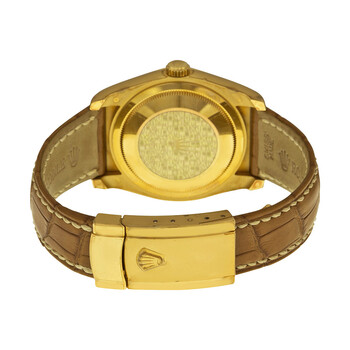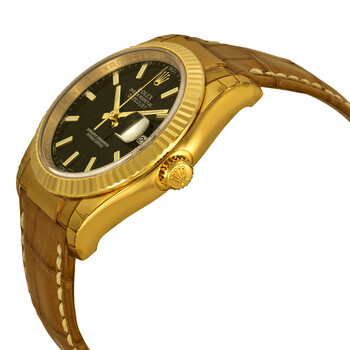 18kt yellow gold case with a brown leather strap. Fixed 18kt yellow gold fluted bezel. Black dial with luminous hands and luminous stick hour markers. Minute markers around the outer rim. Dial Type: Analog. Luminescent hands and dial markers. Date display at the 3 o'clock position. Automatic movement. Scratch resistant sapphire crystal. Solid case back. Case diameter: 36 mm. Round case shape. Fold-through buckle deployment clasp. Water resistant at 100 meters/ 330 feet. Functions: hours/ minutes/ seconds/ date. Luxury watch style. Watch label: Swiss Made. Item Variations: 116138, 116138-BKSL, Rolex-116138, Rolex-116138-BKSL. Rolex Datejust Black Dial 18kt Yellow Gold Brown Leather Strap Men's Watch 116138BKSL.