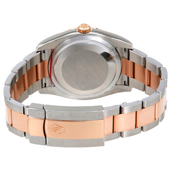 Stainless steel case with a stainless steel bracelet with 18kt pink gold center links. Turn-o-graph 18kt pink gold bezel. Black dial with pink gold-tone hands and index hour markers. Minute markers around the outer rim. Dial Type: Analog. Luminescent hands and markers. Date display at the 3 o'clock position. Rolex calibre 3135 automatic movement with a 50-hour power reserve. Scratch resistant sapphire crystal. Screw down crown. Solid case back. Case size: 36 mm. Round case shape. Oyster clasp. Water resistant at 100 meters / 330 feet. Functions: date, hour, minute, second, chronometer. Luxury watch style. Watch label: Swiss Made. Rolex Datejust Black Dial Automatic Pink Gold and Stainless Steel Men's Watch 116261BKSO.