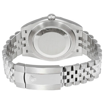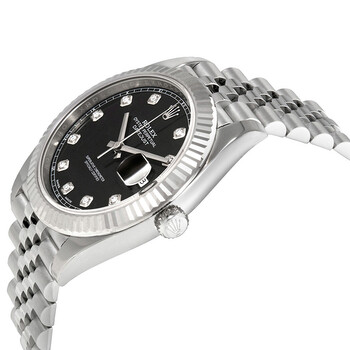Stainless steel case with a stainless steel Rolex jubilee bracelet. Fixed fluted stainless steel bezel. Black dial with silver-tone hands and diamond / small Roman numeral hour markers. Minute markers around the outer rim. Dial Type: Analog. Date display at the 3 o'clock position. Rolex calibre 3235 automatic movement with a 70-hour power reserve. Scratch resistant sapphire crystal. Screw down crown. Solid case back. Case size: 41 mm. Round case shape. Oyster clasp. Water resistant at 100 meters / 330 feet. Functions: date, hour, minute, second. Luxury watch style. Watch label: Swiss Made. Rolex Datejust Black Diamond Dial Automatic Men's Jubilee Watch 126334BKDJ.