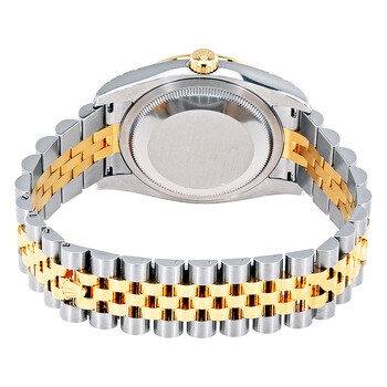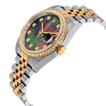Stainless steel case with a stainless steel Rolex jubilee bracelet with 18kt yellow gold center links. Fixed 18kt yellow gold bezel set with diamonds. Black mother of pearl dial with yellow gold-tone hands and diamond hour markers. Dial Type: Analog. Date display at the 3 o'clock position. Rolex calibre 3135 automatic movement with a 48-hour power reserve. Scratch resistant sapphire crystal. Screw down crown. Solid case back. Case size: 36 mm. Round case shape. Concealed folding crown clasp. Water resistant at 100 meters / 330 feet. Functions: date, hour, minute, second. Luxury watch style. Watch label: Swiss Made. Rolex Datejust Black Mother of Pearl Dial Automatic Ladies 18 Carat Yellow Gold and Stainless Steel Watch 116243BKMDJ.