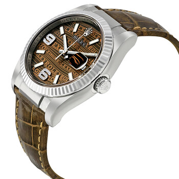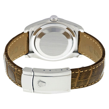 18kt white gold case with a bronze leather strap. Fixed 18kt white gold bezel. Brown dial with luminous hands and index hour markers. Diamond-set Arabic numerals appear at the 6 and 9 o'clock positions. Dial Type: Analog. Luminescent hands and dial markers. Date display at the 3 o'clock position. 31 jewels automatic movement with a 50-hour power reserve. Scratch resistant sapphire crystal. Case diameter: 36 mm. Round case shape. Deployment clasp. Water resistant at 100 meters/ 330 feet. Functions: hours/ minutes/ seconds/ date. Luxury watch style. Watch label: Swiss Made. Rolex Datejust Brown Jubilee Brown Dial Bronze Leather Strap Men's Watch 116139BRJASL.