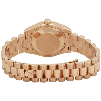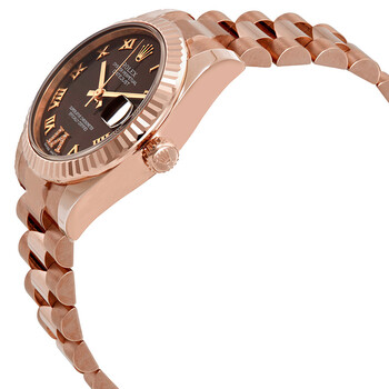 18kt everose gold case with a 18kt everose gold rolex president bracelet. Fixed, fluted 18kt everose gold bezel. Chocolate dial with rose gold-tone hands and Roman numeral hour markers. Dial Type: Analog. Date display at the 3 o'clock position. Automatic movement. Scratch resistant sapphire crystal. Screw down crown. Solid case back. Round case shape. Case size: 31 mm. Water resistant at 100 meters / 330 feet. Functions: date, hour, minute, second. Luxury watch style. Watch label: Swiss Made. Rolex Datejust Chocolate Dial Automatic Ladies 18kt Everose Gold President Watch 178275CHRDP.