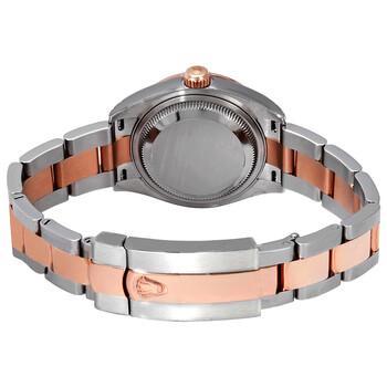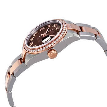 Stainless steel case with a stainless steel and 18k everose gold rolex oyster bracelet. Fixed-diamond set 18k everose gold bezel. Chocolate dial with everose gold hands and Roman numeral hour markers. Dial Type: Analog. Date display at the 3 o'clock position. Rolex Calibre 2236 automatic movement with a 55-hour power reserve. Scratch resistant sapphire crystal. Screw down crown. Solid case back. Round case shape. Case size: 28 mm. Water resistant at 100 meters / 330 feet. Functions: date, hour, minute, second. Additional Info: bezel set with 46 diamonds. Luxury watch style. Watch label: Swiss Made. Rolex Datejust Chocolate Dial Automatic Ladies Steel and 18K Everose Gold Oyster Watch 279381CHRO.