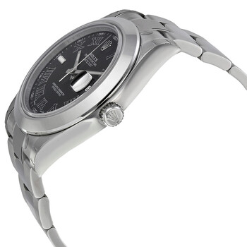 Stainless steel case with a stainless steel Rolex oyster bracelet. Fixed domed stainless steel bezel. Black dial with silver-tone hands and Roman numeral hour markers. Minute markers around the outer rim. Dial Type: Analog. Date display at the 3 o'clock position. Automatic movement with a 48-hour power reserve. Scratch resistant sapphire crystal. Screw down crown. Solid case back. Case diameter: 41 mm. Round case shape. Oyster clasp. Water resistant at 100 meters / 330 feet. Functions: date, hour, minute, second. Luxury watch style. Watch label: Swiss Made. Rolex Datejust II Black Dial Stainless Steel Rolex Oyster Automatic Men's Watch 116300BKRO.