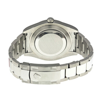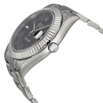 Stainless steel case with a stainless steel Rolex oyster bracelet. Fixed fluted 18kt white gold bezel. Black dial with luminous silver-tone hands and Roman numeral hour markers. Minute markers around the outer rim. Dial Type: Analog. Luminescent hands. Date display at the 3 o'clock position. Rolex calibre 3136 automatic movement with a 48-hour power reserve. Scratch resistant sapphire crystal. Screw down crown. Solid case back. Case size: 41 mm. Round case shape. Oysterlock clasp. Water resistant at 100 meters / 330 feet. Functions: date, hour, minute, second. Luxury watch style. Watch label: Swiss Made. Rolex Datejust II Automatic Black Dial Stainless Steel Rolex Oyster Men's Watch 116334BKRO.