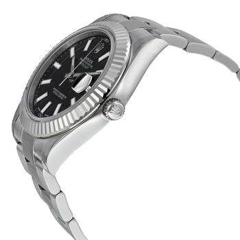 Stainless steel case with a stainless steel Rolex oyster bracelet. Fixed fluted 18kt white gold bezel. Black dial with silver-tone hands and stick hour markers. The Rolex logo appears at the 12 o'clock position. Minute markers around the outer rim. Dial Type: Analog. Luminescent hands and dial markers. Date display at the 3 o'clock position. Automatic movement with a 48-hour power reserve. Scratch resistant sapphire crystal. Screw down crown. Solid case back. Case size: 41 mm. Round case shape. Oysterlock clasp. Water resistant at 100 meters / 330 feet. Functions: date, hour, minute, second. Luxury watch style. Watch label: Swiss Made. Item Variations: 116334. Rolex Datejust II Black Dial Stainless Steel Rolex Oyster Automatic Men's Watch 116334BKSO.