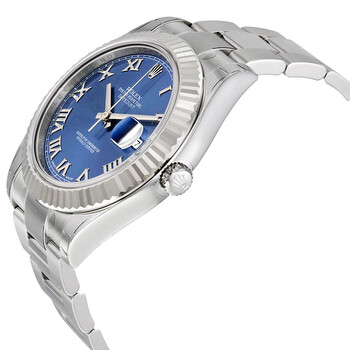 Stainless steel case with a stainless steel Rolex oyster bracelet. Fixed fluted 18kt white gold bezel. Blue dial with silver-tone hands and Roman numeral hour markers. Minute markers around the outer rim. Dial Type: Analog. Date display at the 3 o'clock position. Automatic movement with a 48-hour power reserve. Scratch resistant sapphire crystal. Screw down crown. Solid case back. Case size: 41 mm. Round case shape. Oysterlock clasp. Water resistant at 100 meters / 330 feet. Functions: date, hour, minute, second. Luxury watch style. Watch label: Swiss Made. Item Variations: 116334 BLRO, 116334.BLRO, 116334BLRO. Rolex Datejust II Automatic Blue Dial Stainless Steel Rolex Oyster Men's Watch 116334BLRO.