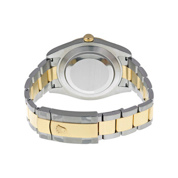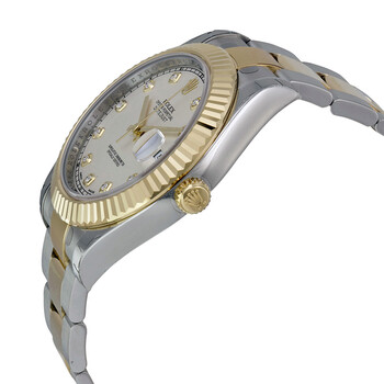Stainless steel case with a stainless steel Rolex oyster bracelet with 18kt yellow gold center links. Fixed fluted 18kt yellow gold bezel. Ivory dial with yellow gold hands and diamond hour markers. Minute markers around the outer rim. Dial Type: Analog. Date display at the 3 o'clock position. Automatic movement with a 48-hour power reserve. Scratch resistant sapphire crystal. Screw down crown. Solid case back. Case size: 41 mm. Case thickness: 13 mm. Round case shape. Band width: 18 mm. Band length: 8 inches. Oysterlock clasp. Water resistant at 100 meters / 330 feet. Functions: date, hour, minute, second. Luxury watch style. Watch label: Swiss Made. Rolex Datejust II Automatic Ivory Dial Stainless steel and 18kt Yellow Gold Rolex Oyster Men's Watch 116333IDO.