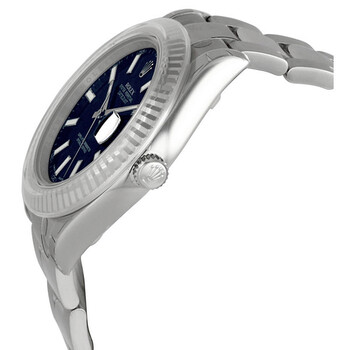 Stainless steel case with a stainless steel Rolex oyster bracelet. Fixed fluted 18kt white gold bezel. Blue dial with luminous silver-tone hands and index hour markers. Minute markers around the outer rim. Dial Type: Analog. Luminescent hands and dial markers. Date display at the 3 o'clock position. Rolex calibre 3136 automatic movement with a 48-hour power reserve. Scratch resistant sapphire crystal. Screw down crown. Solid case back. Case size: 41 mm. Round case shape. Oysterlock clasp. Water resistant at 100 meters / 330 feet. Functions: date, hour, minute, second, chronometer. Luxury watch style. Watch label: Swiss Made. Rolex Datejust II Blue Dial Stainless Steel Rolex Oyster Automatic Men's Watch 116334BLSO.